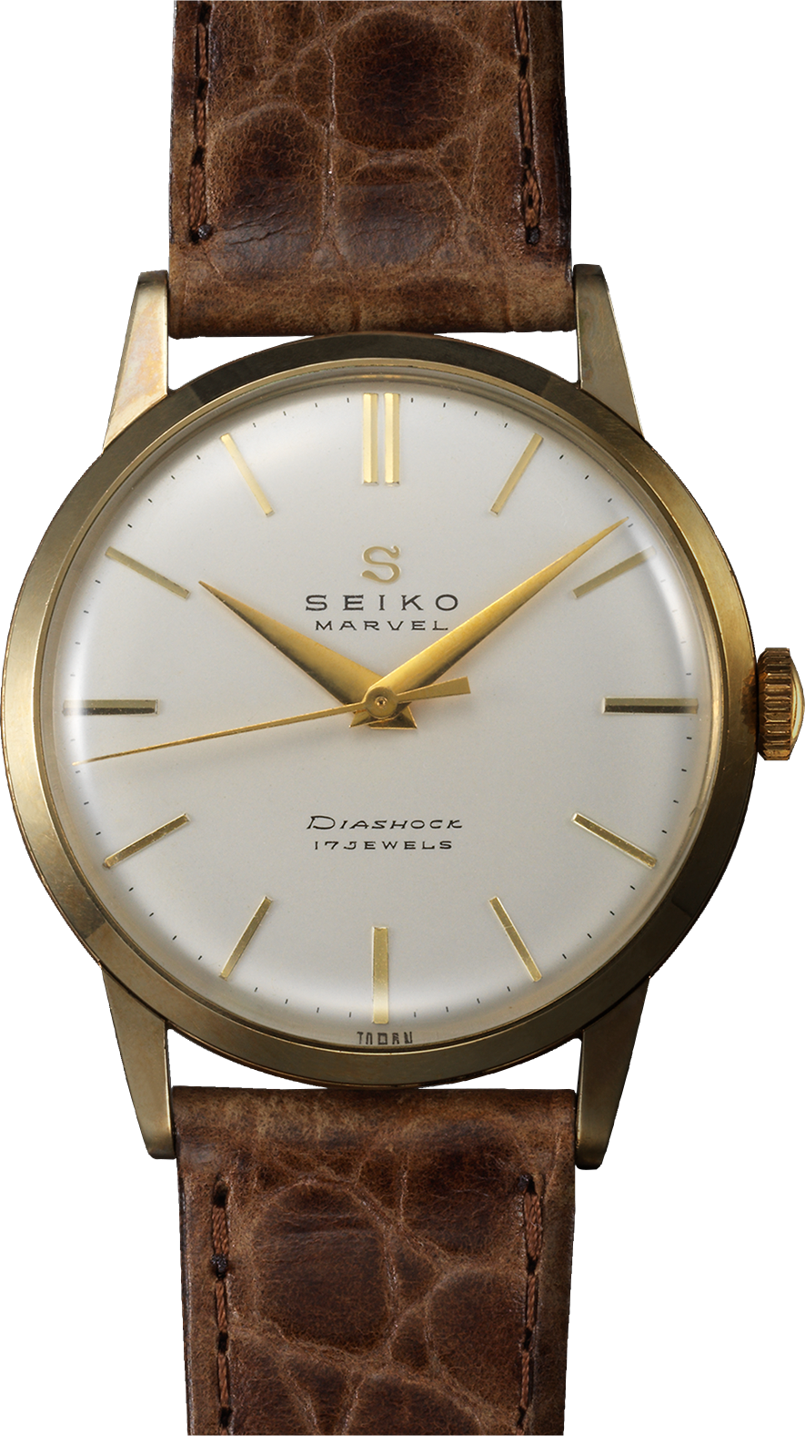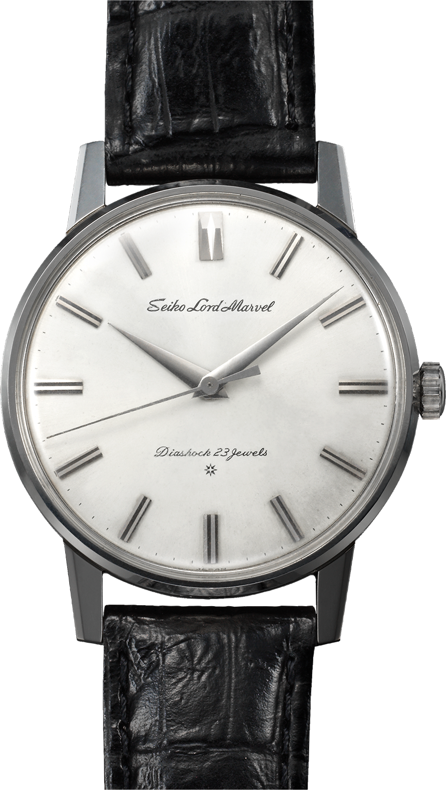 The first watch with an original Seiko design, it focused on the fundamental principles of wristwatches: it must be accurate, unbreakable, and beautiful. Larger components helped to stabilize functionality and improve accuracy, and soon the Marvel was dominating domestic watch competitions.