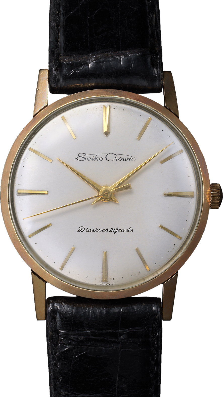 The now-famous first Grand Seiko. Priced at more than JPY 25,000 (about two times the average starting salary of a company employee with a university degree at that time). In addition to the gold-plated case shown in the photo, a very small number of platinum editions were produced, a first for Seiko.